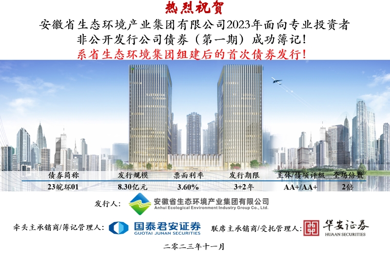 11月24日,省生態(tài)環(huán)境集團(tuán)首單非公開公司債券(債券簡(jiǎn)稱:23皖環(huán)01,債券代碼:253104.SH)在上海證券交易所成功簿記發(fā)行,本次債券由國泰君安、華安證券主承銷,募集金額8.3億元,期限3+2年,票面利率3.60%,圓滿完成集團(tuán)掛牌以后在資本市場(chǎng)的首次亮相。