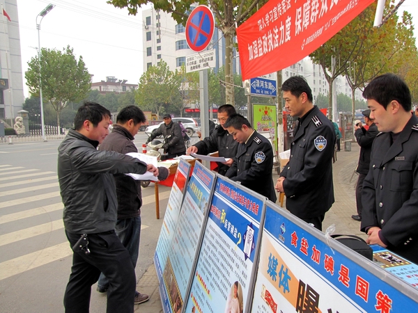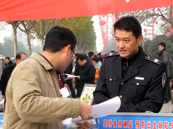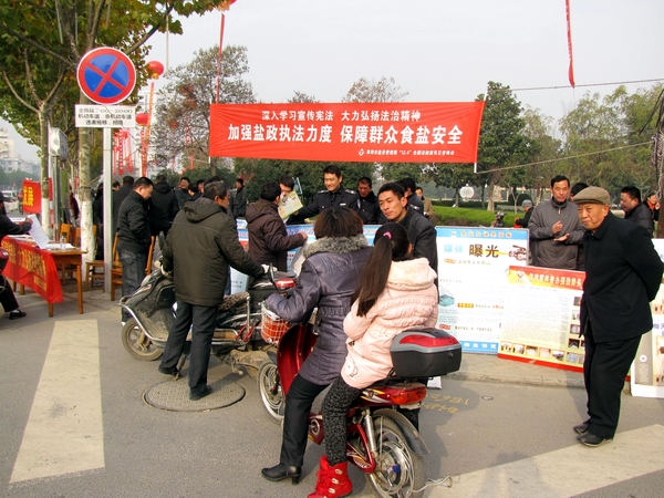 阜陽市鹽務(wù)局高度重視此次宣傳活動(dòng),結(jié)合自身業(yè)務(wù)范疇,精心準(zhǔn)備大量法制宣傳資料。早晨7時(shí),天氣陰冷,寒風(fēng)勁吹,我局鹽政執(zhí)法人員在副局長(zhǎng)王道亞的帶領(lǐng)下,早早地布置好法制宣傳臺(tái)。在活動(dòng)現(xiàn)場(chǎng)王道亞親自向過往群眾宣傳鹽政法律法規(guī)知識(shí),宣傳消費(fèi)者、經(jīng)營(yíng)者的權(quán)利和義務(wù),宣傳消費(fèi)者如何依法維權(quán);進(jìn)行了假冒偽劣食鹽展示和鑒別;開展了涉鹽咨詢、受理投訴舉報(bào)。此次宣傳共發(fā)放宣傳資料500余份,接受群眾咨詢200余人次。活動(dòng)現(xiàn)場(chǎng)布置了咨詢展臺(tái),擺放宣傳圖板10塊、宣傳展架3個(gè)、懸掛 2條生動(dòng)主題橫幅,展示了近期查獲的部分劣質(zhì)私鹽樣品,教市民辨別真假碘鹽的活動(dòng),咨詢臺(tái)前觀看宣傳圖版和前來咨詢的群眾絡(luò)繹不絕,受到了親自趕赴現(xiàn)場(chǎng)慰問的市人大常委副主任李新才、市政府副市長(zhǎng)黃珍、市政協(xié)副主席張永俠、市委宣傳部、市司法局和市依法治市領(lǐng)導(dǎo)小組辦公室有關(guān)領(lǐng)導(dǎo)以及廣大群眾的一致好評(píng)。