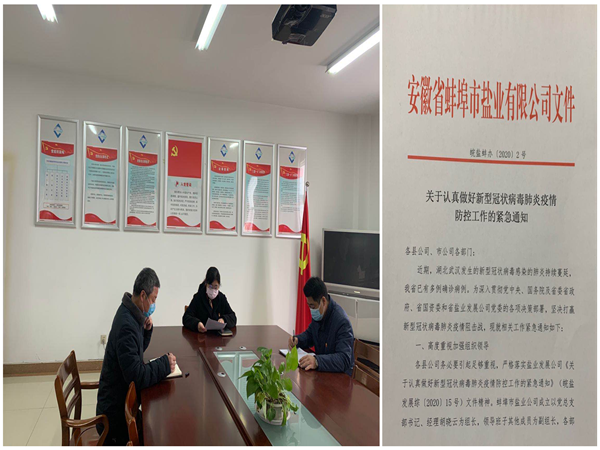 1月27日蚌埠鹽業(yè)公司黨總支召開了緊急會(huì)議,深入貫徹中央和上級黨委有關(guān)疫情防控的各項(xiàng)決策部署,制定了《關(guān)于認(rèn)真做好新型冠狀病毒肺炎疫情防控工作的緊急通知》(皖鹽蚌辦〔2020〕2號)。成立了以黨總支書記、經(jīng)理為組長,總支班子成員為副組長,各部門主要負(fù)責(zé)人為成員的新型冠狀病毒防控工作領(lǐng)導(dǎo)小組,要求市縣公司全方位積極做好疫情防控,立即啟動(dòng)特殊時(shí)期食鹽供應(yīng)緊急預(yù)案,市縣公司班子成員以及保障食鹽供應(yīng)的相關(guān)業(yè)務(wù)崗位人員,要第一時(shí)間全部到崗就位,堅(jiān)守疫情防控第一線,堅(jiān)守食鹽保障供應(yīng)第一線,實(shí)行24小時(shí)領(lǐng)導(dǎo)帶班值班制,抗疫情,保供應(yīng),眾志成城,義不容辭。