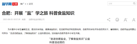 2023年7月,合肥鹽業(yè)自1950年成立以來首次對外開放,面向全市中小學生,開展“鹽”學之旅,食鹽科普游活動,活動內(nèi)容包括參觀60年歷史的鐵路專用線、省市食鹽儲備倉庫,食鹽健康科普講座,7月份接待來自國內(nèi)外7所中小學校170名學生和家長,8月份已預約8場食鹽科普游。