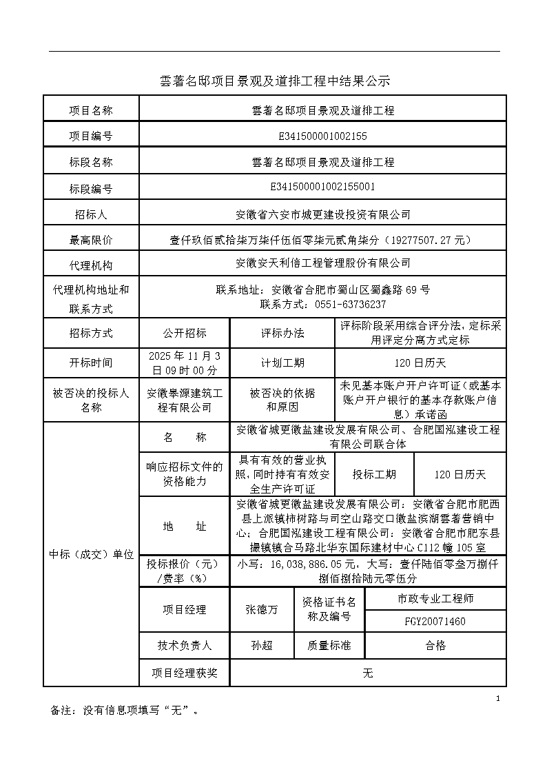 雲(yún)著名邸項(xiàng)目景觀及道排工程中結(jié)果公示