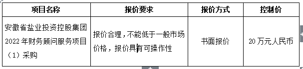 1.項(xiàng)目名稱(chēng):安徽省鹽業(yè)投資控股集團(tuán)2022年財(cái)務(wù)顧問(wèn)服務(wù)項(xiàng)目(1)