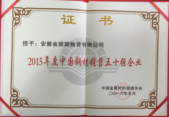 安徽順朝公司蟬聯(lián)“中國鋼材銷售五十強(qiáng)企業(yè)”稱號(hào)