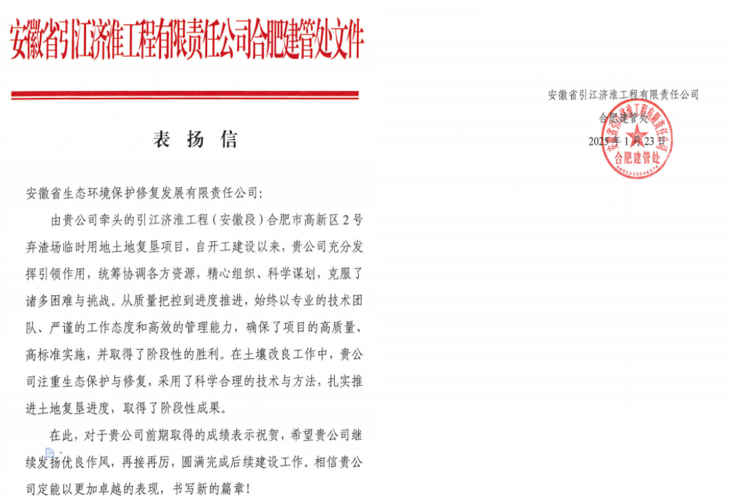 新年的第一封表揚(yáng)信帶著溫暖而至,1月23日,安徽省引江濟(jì)淮工程有限責(zé)任公司合肥建管處致表揚(yáng)信,信中對(duì)生態(tài)修復(fù)公司牽頭的引江濟(jì)淮工程(安徽段)合肥市高新區(qū)2號(hào)棄渣場(chǎng)臨時(shí)用地土地復(fù)墾項(xiàng)目的建設(shè)質(zhì)量、進(jìn)度推進(jìn)以及土壤改良等方面的工作給予充分肯定,對(duì)項(xiàng)目部同事的專業(yè)素養(yǎng)和工作作風(fēng)給予高度贊揚(yáng)。