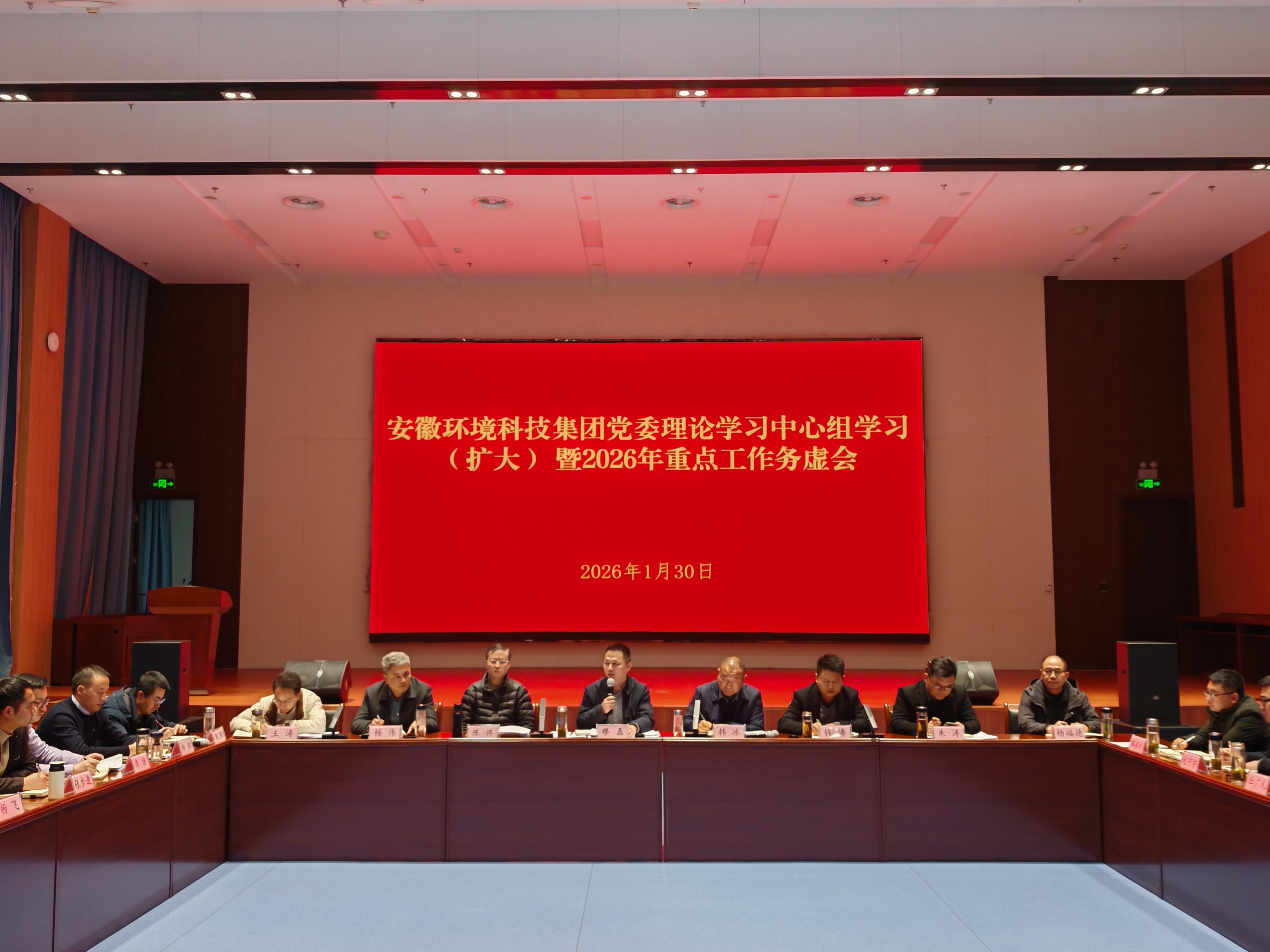 2026年1月30日,安徽環(huán)境科技集團黨委理論學習中心組學習(擴大)暨2026年度務虛會在合肥召開。會議深入學習領會黨中央及省委、省政府近期系列重要會議精神,全面分析內(nèi)外部形勢,系統(tǒng)謀劃2026年發(fā)展藍圖,統(tǒng)一思想、凝聚共識,為在新起點上推動公司轉(zhuǎn)型發(fā)展、實現(xiàn)華麗轉(zhuǎn)身擘畫了清晰路徑。集團黨委書記、董事長繆磊出席會議并講話,黨委副書記、總經(jīng)理韓冰作年度形勢任務分析報告。集團領導班子成員、總經(jīng)理助理、首席研究員、各部門負責人、各子(項目)公司負責人參加會議。
